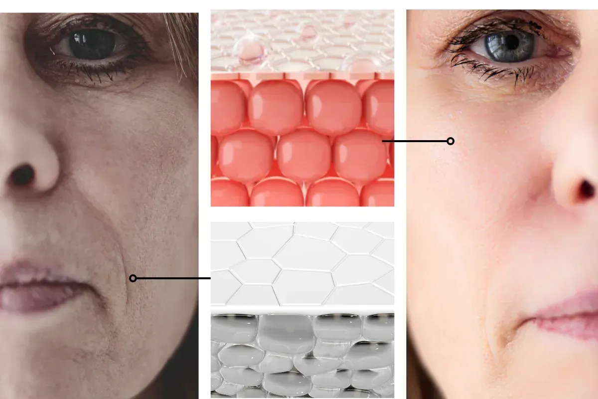 Left: Tired, "forgetful" skin cells contributing to wrinkles and sagging. Right: Energized, "youthful" cells after Skin Spectra treatment, actively rebuilding and rejuvenating your skin.